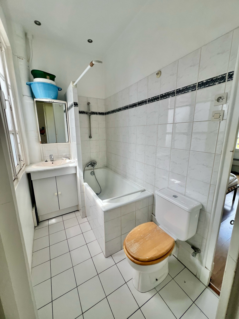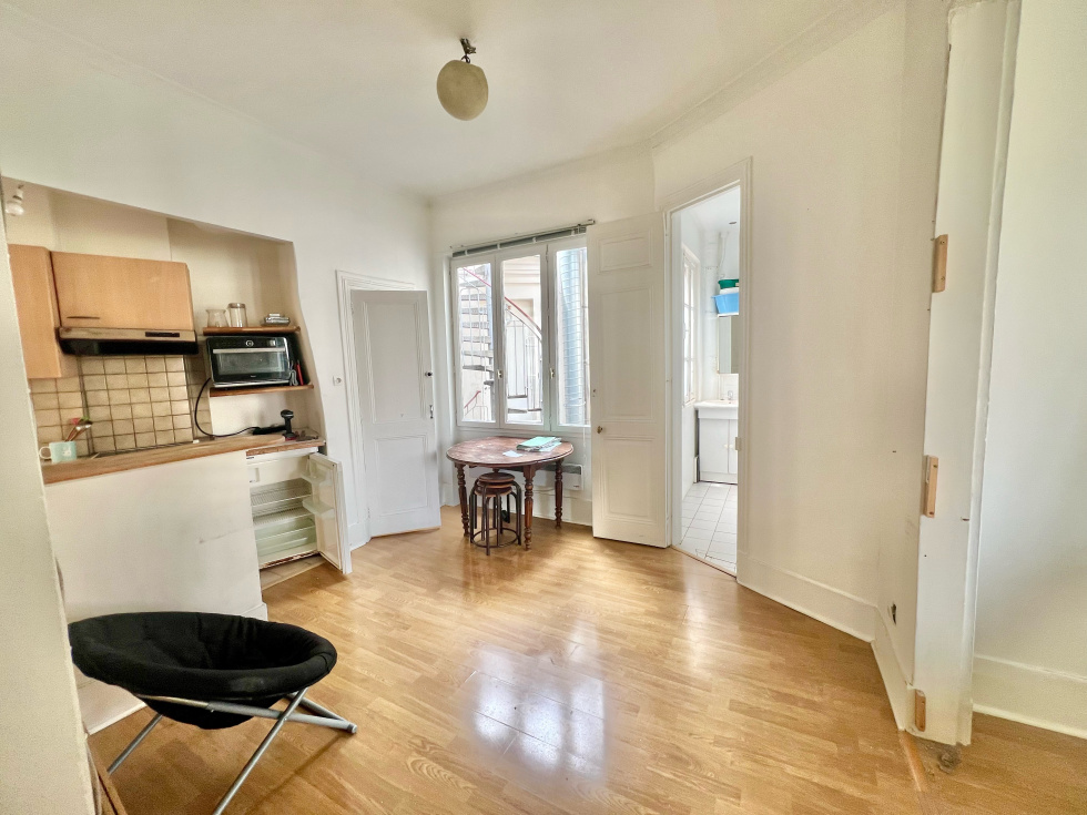 14eme limite 6eme, au pied du Metro Vavin et au Coeur du quartier Montparnasse, proche commerces, transports (Métro, bus, Gare Montparnasse), et des écoles, dans un immeuble ancien au 5eme etage sur boulevard et cour, appartement de 2/3p pricipales comprenant : entrée, séjour avec 2 fenetres, 1 chambre, 1 cuisine avec espace repas/salle à manger, 1sdb/wc. Bon Plan sans couloir, lumineux et idealement placé. Cave